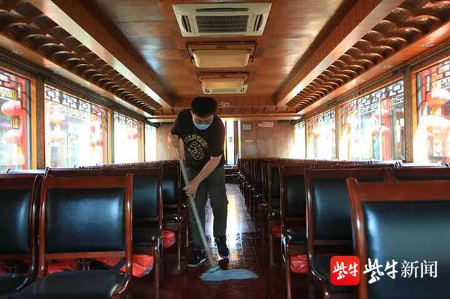 为给游客提供一个舒适安全的游船环境,工作人员定时定点对游船的地面、座椅以及各个角落进行消毒。工作人员特别提醒市民和游客,乘坐游船时请戴好口罩,主动接受体温测量,服从工作人员管理,进行扫码登记、隔位就坐、文明游览、安全游览。