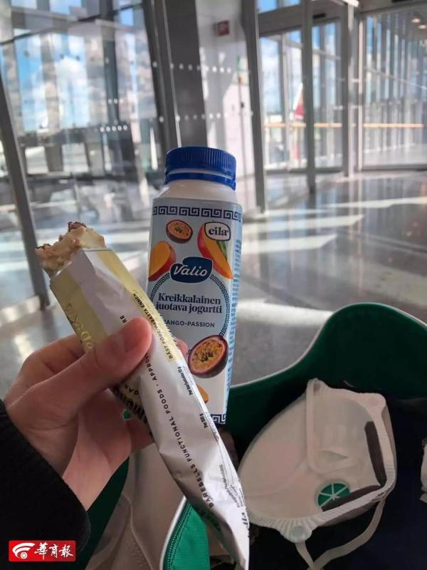 赫尔辛基万塔机场旅客输送量较小,转机时间为3小时,闫肃没去餐厅而是买了一根巧克力能量棒、一杯酸奶,找到一个没人的角落快速吃完。机场空荡荡的,本应热闹的各类免税店门可罗雀,餐厅里也鲜有旅客。