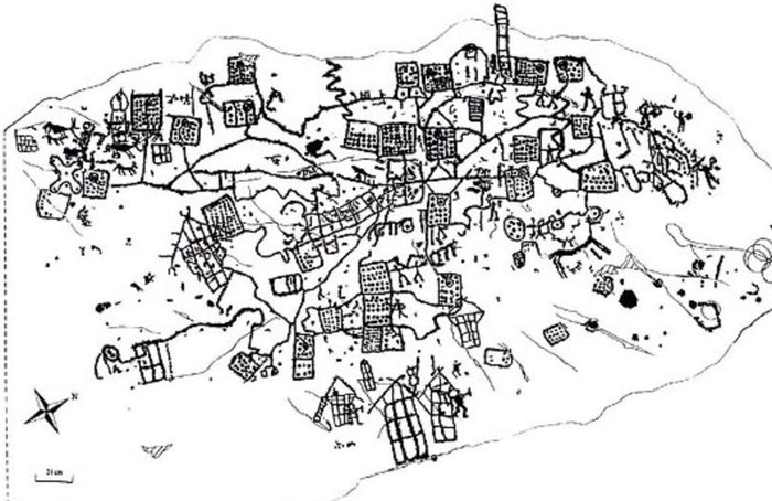 那么,在西方文明圈里,得到广泛认可的最早的地图是哪一幅呢?一般认为是发现于意大利伦巴第大区布雷西亚省的贝多莱纳地图(Bedolina Map)。这幅地图是卡莫尼卡山谷岩画群的其中一幅图画,被刻在了贝多莱纳的一号岩石上。这块岩石宽4.3米、高2.4米,上面密密麻麻地画满了房屋、道路和田野,甚至还画有行人和动物。如果是加泰土丘的那副壁画只能被称作风景画的话,贝多莱纳的这幅岩画就是无可争议的地图。