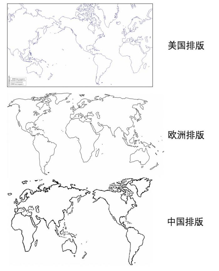 在这幅地图上,巴比伦被画在了靠近地图中心的区域。这也是世界各地的古文明不约而同地形成的一个传统,即认为自己所在的区域是世界的中心。这也和古代人有限的大尺度空间感知有关。这样的传统也延续至今。如果你有机会观察,你会发现世界各国出版的世界地图排版都有所不同。中国等东亚国家出版的世界地图,会把国际日期变更线放在地图中央,这样一来东亚就处于接近地图中央的位置,而大西洋被一分为二,位于地图的两侧;欧洲各国出版的地图会把格林威治0°经线放在地图的中心,而太平洋则被一分为二;美国的世界地图一般会把穿越堪萨斯州的西经90°经线放在地图的中心,欧亚大陆会被一分为二。