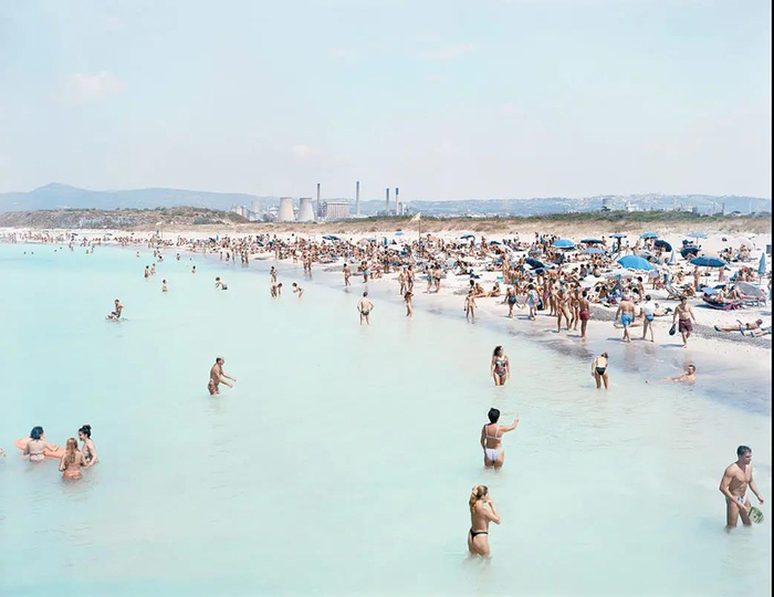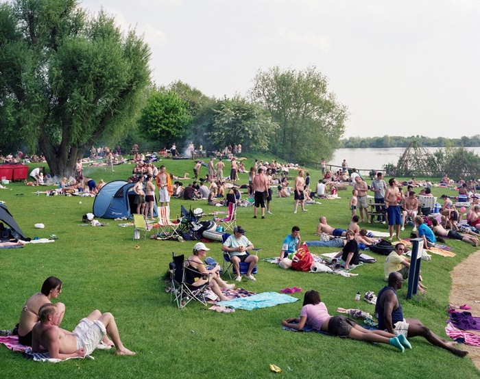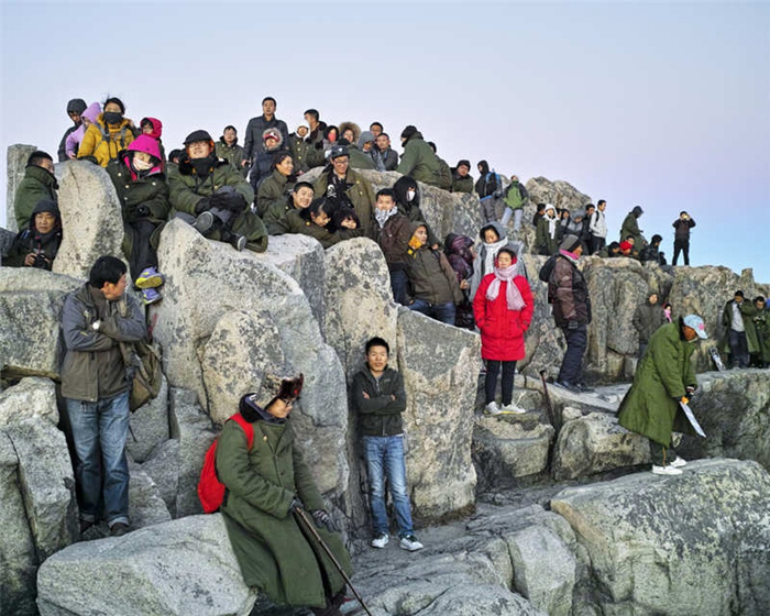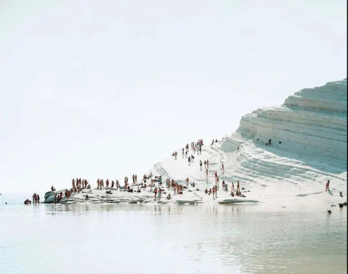 我们通过《游山玩水》看到了这样一种情景:中国人在室外的休闲娱乐。有人说了,休闲娱乐有什么好奇怪的?这不是好奇,休闲娱乐是当下的一种社会现象,社会学家一直在对社会现象进行分析研究。比如以福柯(Michel Foucauh)有关“凝视”的著述为基础,英国社会学家约翰·厄里(John Urry)提出“旅游凝视”( tourist gaze)理论,中国学者刘丹萍写了一本《旅游凝视:中国本土研究》。细心的读者发现,黎明的这组作品恰恰可以从影像的角度来印证这些社会学家的学问,使这组作品有了社会学意义上的高度(这里暂不阐述影像审美意义)。当然,艺术作品并不是社会研究的简单图解。这组作品还可以从“休闲消费”(让·鲍德里亚著作《消费社会》、西莉亚·卢瑞著作《消费文化》),或者社会景观(居伊·德波《景观社会》),或者大众的集体无意识(瑞士心理学家荣格的分析心理学用语)等多种层面来对当下人们的行为进行自我审视和自我反思。然后视野广阔的读者会发现,意大利摄影师马西莫·维塔利(MassimoVitali)拍过《自然栖息地》(NaturalHabitats),英国摄影师西蒙·罗伯茨(Simon Roberts)拍过《我们英国人》(We English),这些摄影师以类似的方式拍摄了各自国家的旅游休闲文化,最后我们能从这些不同摄影师的照片中看出民族文化的差异性。