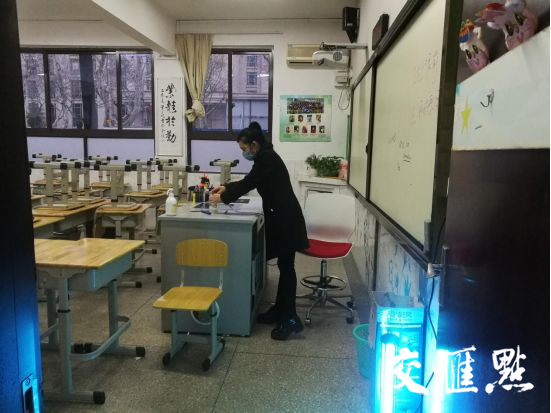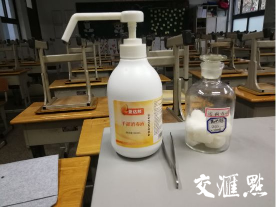 南京九中的物业人员每天按时对校园内的各个场所进行消杀工作,每间教室的讲台配备酒精棉和消毒液,方便师生取用。每天放学后,物业人员将对教室进行通风和全面的卫生消杀处理。