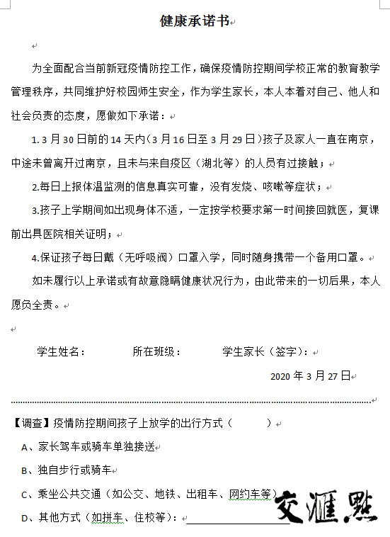 另外,以《健康承诺书》的方式告知家长,孩子入学必须符合相关规定,入学时携带好包括《健康承诺书》在内的相关物件(如口罩等)方可入校。