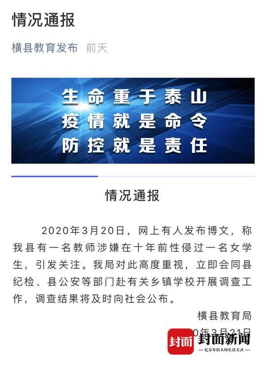 赵丽的手写信在网络发布后,引发社会关注。横县教育局官方微信“横县教育发布”在3月21日发布情况通报:2020年3月20日,网上有人发布博文,称我县有一名教师涉嫌在十年前性侵过一名女学生,引发关注。我局对此高度重视,立即会同县纪检、县公安等部门赴有关乡镇学校开展调查工作,调查结果将及时向社会公布。
