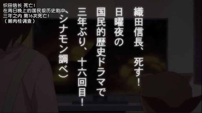 如果剧情仅仅围绕着宠物犬之间的插科打诨展开,即使将动物造型转变为拟人化设定,恐怕仍然与《米老鼠与唐老鸭》或是《猫和老鼠》这样的经典作品一样难脱低幼化的嫌疑。这部动画片的主要看点恰恰不在于无厘头式的搞笑——虽然仍会不时出现类似的冷幽默。从深层次上看,《织田肉桂信长》其实倒可以算作一部精心构思的历史知识科普动画片。