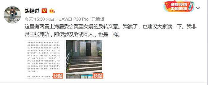 今天下午3时许,环球时报总编辑胡锡进在微博上谈及这则新闻“反转”一事,他转发了两篇认为上述事件中的“洋女婿”并未违反隔离规定的长文截图并配文说,“这里有两篇上海居委会英国女婿的反转文章。我读了,也建议大家读一下。我非常主张兼听,即使涉及老胡本人,也是一样。”