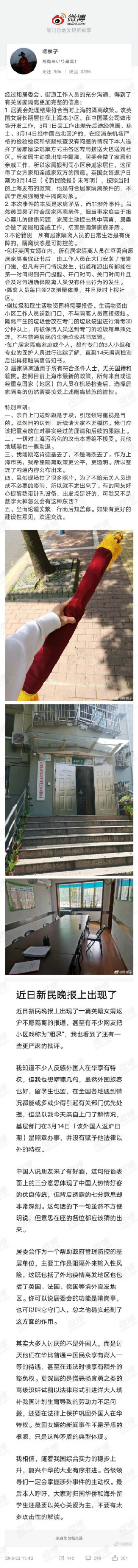 另一篇微博网友发布的长文表示,上述英国女婿返沪日期为3月14日,“按照当时的上海发布的政策,他是符合居家隔离条件的,不属于定点强制隔离对象。”
