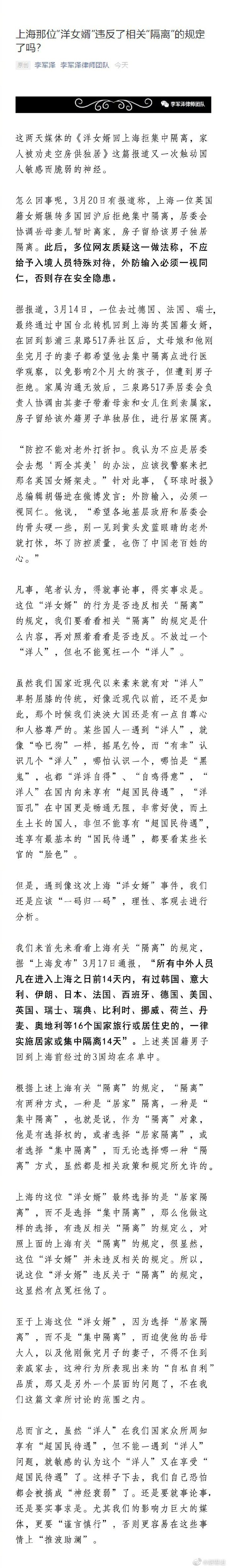 第一篇为微信公众号“李军泽律师团队”发布的文章,其中提到跟据“上海发布”3月17日通报,所有中外人员凡在进入上海之日前14天内,有过韩国、意大利、伊朗、日本、法国、西班牙、德国、美国、英国、瑞士、瑞典、比利时、挪威、荷兰、丹麦、奥地利等16个国家旅行或居住史的,一律实施居家或集中隔离14天。文章认为,上述英国籍男子回到上海前经过的3国均在名单中,与此同时,目前上海也允许有条件的居家隔离。由此判断,该“洋女婿”个人选择了“居家隔离”,并未违反相关隔离规定。