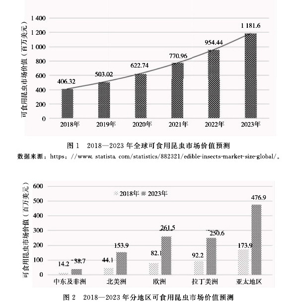 南京农业大学经济管理学院副教授胡家香、刘爱军等专家在《世界农业》(2019年第4期)上撰文介绍,有国际市场调研机构对2018-2023年全球可食用昆虫市场价值进行统计分析发现,预计到2023年,可食用昆虫的市场价值将达到11.82亿美元,年复合增长率为23.80%。其中,亚太地区预计达到4.77亿美元,年复合增长率为22.36%。