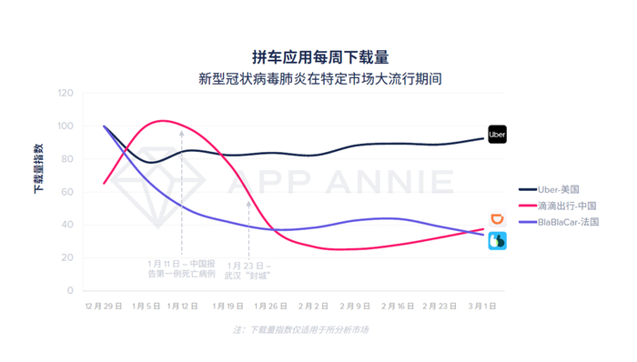 尤其当用户希望避免面对面接触时,打车软件的下载量受影响不小。数据分析机构App Annie最新发布的数据显示,在2019 年 1 月 29 日至 2020 年 3 月 7 日期间,滴滴出行的每周下载量成下降趋势,降幅达到 75%,不过从趋势看下载量正在回升。