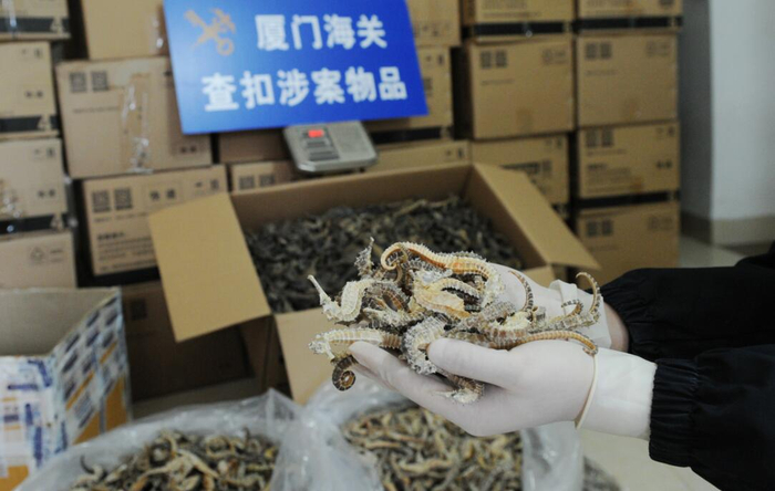 3月23日,在海关总署统一部署下,广东分署缉私局协调厦门、广州、深圳、拱北海关缉私局,出动150余名警力,在福建、广东两省七地同步开展集中收网行动,破获一起走私濒危野生动物海马干案件,打掉4个走私团伙,26名主要犯罪嫌疑人全部落网,现场查获被列入CITES公约附录Ⅱ的海马干716千克。
