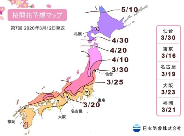 每年,日本气象株式会社都会在年初公布本年度樱花盛开的时间。今年的第一次预测在1月9日,当时预计2020年东京的樱花将于3月19日左右开放,于3月27日前后满开。当日,按照往年的惯例,后期都会根据具体天气变化做出更正。