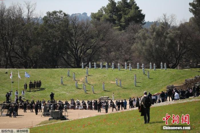 资料图:受新冠肺炎疫情影响,圣火采集仪式限制了观众人数,只有100名受邀嘉宾才能参与这一传统活动。