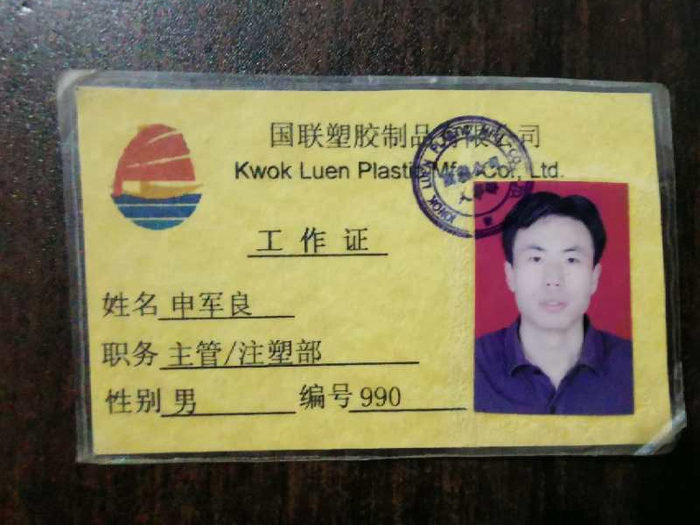 申军良十七年前的工作牌。当时作为部门主管,他曾管理数千名员工。