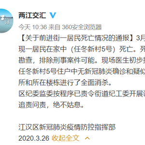 3月25日下午5时左右,前进街任冬社区发现一居民在家中(任冬新村5号)死亡。死者周某某,男,64岁。经公安部门现场勘查,排除刑事案件可能。现场医生初步推断其死于脑梗塞。自疫情发生以来,任冬新村5号住户中无新冠肺炎确诊和疑似病例。当天,卫生防疫部门已对死者住所和所在楼栋进行了全面消杀。