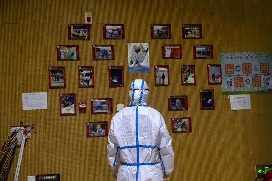 3月9日晚,在武昌方舱医院,医务人员管茜查看贴有该方舱里的新冠肺炎患者和医务人员照片的照片墙,她想找到自己的照片。