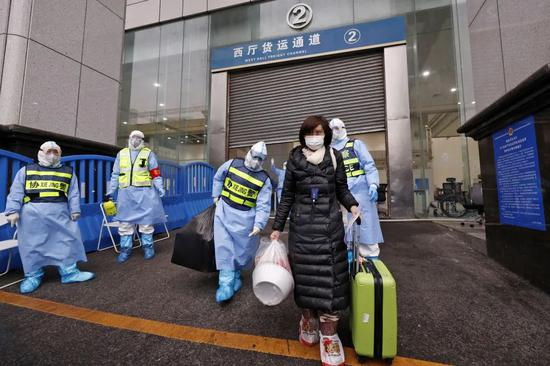 这是3月9日拍摄的最后一名离开江汉方舱医院的治愈患者(前)。