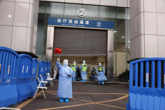 3月9日,华中科技大学同济医学院附属协和医院护士曾娅站在江汉方舱医院治愈患者出口处挥舞国旗,庆祝该方舱医院休舱。