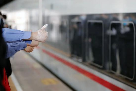 3月17日,在武汉火车站,一名坐上高铁列车即将离开武汉的南华大学附属第一医院医务人员向窗外的欢送人群竖起大拇指,窗外的送行人员也向她竖起大拇指。