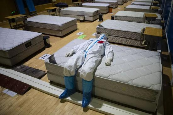 3月9日晚,在武昌方舱医院,湖北省人民医院医生汪文洋结束了在方舱的最后一个夜班,躺在一张空病床上短暂休息。