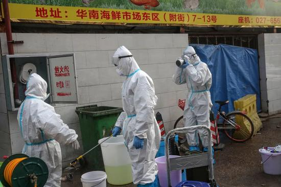2月29日,新华社记者沈伯韩(右)在武汉华南海鲜批发市场采访消毒工人。