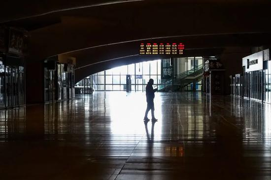 2月18日,武汉火车站里人很少,一名男子走在车站里。