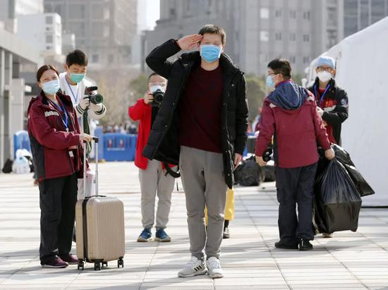 3月10日,上海复旦大学附属华山医院认定的最后一名痊愈出舱病人(前)走出武昌方舱医院时回身向送他的医护人员敬礼。