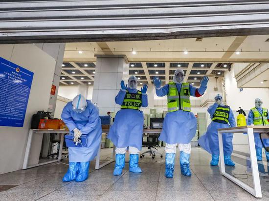 3月9日,最后一名治愈患者离开后,江汉方舱医院治愈患者出口的卷帘门缓缓降下,最后一个离开该方舱医院的武汉协和医院大夫逯翀(左一)向人们鞠躬致意。