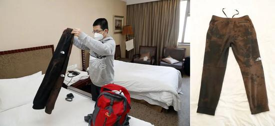 在中南大学湘雅二医院国家紧急医学救援队驻地,消化内科医生吕梁在收拾自己穿过的一条裤子。因为经常使用消毒水浸泡、洗涤,裤子已经部分掉色,呈现出独特的图案,这条裤子是他带走的行李中最有纪念意义的武汉记忆。