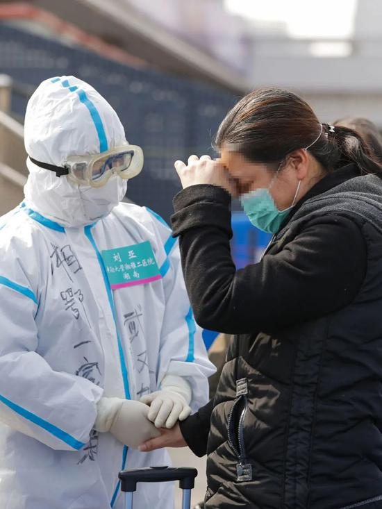 3月10日,在武昌方舱医院病区出口,中南大学湘雅二医院的刘亚(左)握着一名即将出舱、激动落泪的新冠肺炎治愈患者的手。刘亚的防护服上写着“湘鄂一家亲”的字样