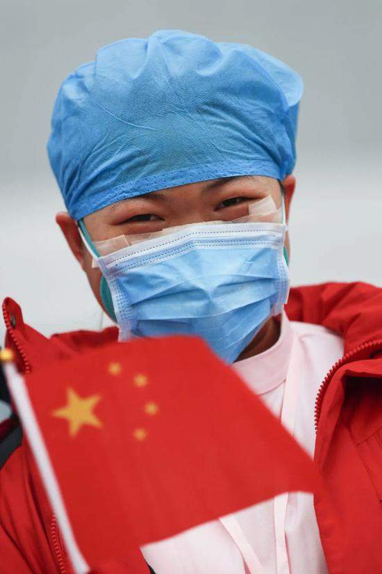 3月9日,在武汉江汉方舱,前来参加休舱仪式的医务人员刘芳挥舞着国旗,她脸上还留有防止脸部被压迫过深而贴的胶带。