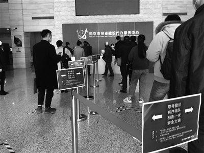 在南京市政务服务中心,市民排队取号都按照中心设置的提示牌保持一米距离。