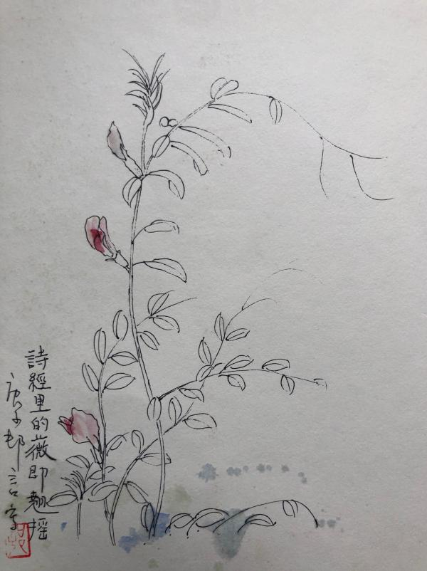 前些天经过高架桥下的一片绿地,意外地在一片野草地里居然发现几枝翘摇,柔柔嫩嫩,上缀一淡红欲飞的小花,允称动人,匆匆写了数笔,采了几枝嫩头,回家汆了一些在汤里,不及豌豆头嫩,略涩,有草味,但说不上难吃,好歹算是食过薇了。
