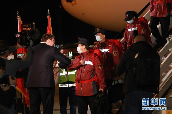 北京时间3月22日,当中国派遣的医疗专家组乘坐塞尔维亚专机到达时,塞尔维亚总统武契奇带领多位政府官员亲自接机,同每一位专家组成员“碰肘”,向五星红旗献上了深情一吻。