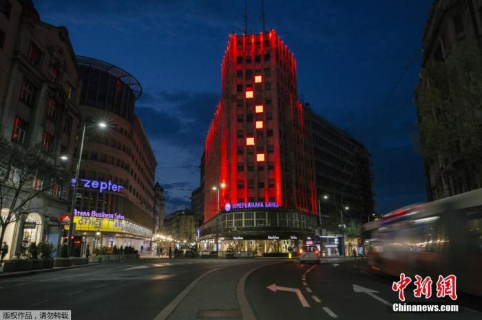 当地时间3月22日,在塞尔维亚贝尔格莱德,阿尔巴尼亚大厦点亮中国红。