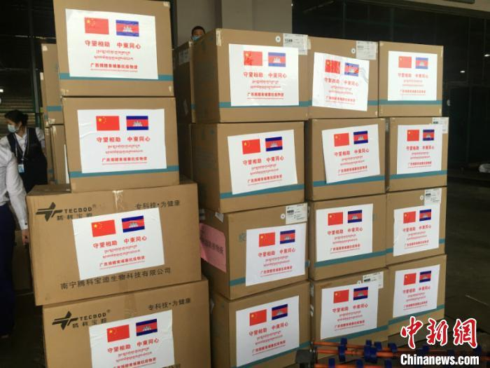 3月23日,一架搭载7名来自广西壮族自治区医疗专家和一批防疫医疗物资的中国南航包机降落在柬埔寨首都金边国际机场。图为广西捐赠柬埔寨的抗疫物资。 桂卫 摄