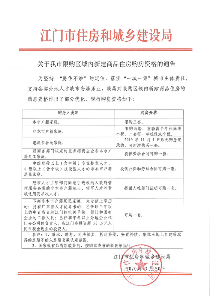 3月27日,广东省江门市住房和城乡建设局发布《关于我市限购区域内新建商品住房购房资格的通告》,对限购区域内新建商品住房的购房资格再次作出优化——外地户籍大专以上学历,无需社保可直接购房1套。