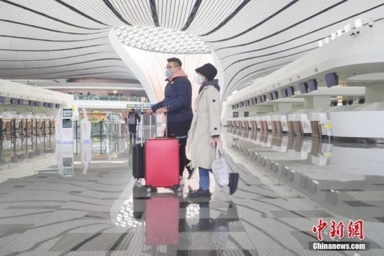 1月26日,受新型冠状病毒感染的肺炎疫情影响,北京大兴国际机场内,旅客戴口罩出行。中新社记者 贾天勇 摄