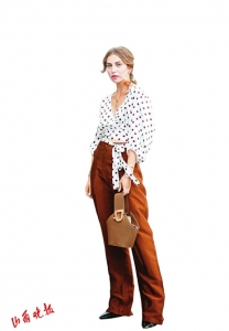 印花元素本身自带亮点,在颜色的选择上,应尽量避免饱和度过高的色系,而选择低饱和度的颜色,这样整体上耐看又时髦,不会给人夸张的“浓墨重彩”之感。在我们的日常穿搭中,单品的底色要和印花图案的颜色整体协调,如果颜色对比过于强烈,就会显得突兀。就印花单品的材质而言,雪纺、丝缎、人造棉、桑蚕丝都是不错的选择。