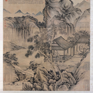 ,虽然竭尽谦恭之能事,但就画题本身及乾隆御题可知,乾隆对董邦达的创意是充分肯定的,在己题之外,还特意命词臣汪由敦、梁诗正、裘日修、励宗万、张若霭题写赞语,极一时之盛。此图著录于《石渠宝笈》二编养心殿中,画题为《画御制三希堂记意轴》,显示出乾隆对其嘉许之意。与此图相同构思的董氏画作是为乾隆所作的《弘历松荫消夏图》(北京故宫博物院藏)。该图描绘的仍然是在万山环抱之中,两间茅庐掩映在松荫之下。乾隆闲坐于山间的几案旁,案上置一古琴、一书及一盂,乾隆静心平气,若有所思。前侧石坡旁一书童正生火煎茶。山间云烟缭绕,曲水飞流,也是一派远离尘嚣的世外之景。此图与《三希堂记意图轴》有异曲同工之妙,深得乾隆称许,因而在上端题诗曰: