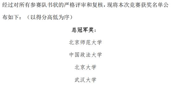 受疫情影响,ICCMCC中国赛区组委会取消了2020年度国际刑事法院模拟法庭英文赛法庭辩论阶段的比赛,竞赛最终成绩根据各队书状评分确定。北师大代表队的书状成绩最终排名第一,取得本次比赛的总冠军奖,刷新了学校参加该比赛以来的历史最好成绩。