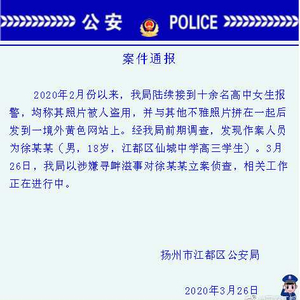 3月26日,扬州市江都区公安局微博“平安江都”发布通报称,2020年2月份以来,该局陆续接到十余名高中女生报警,均称照片被人盗用,并与其他不雅照片拼在一起后发到一境外黄色网站上。经调查,作案人员为徐某某(男,18岁,江都区仙城中学高三学生)。3月26日,该局以涉嫌寻衅滋事对徐某某立案侦查,相关工作正在进行中。