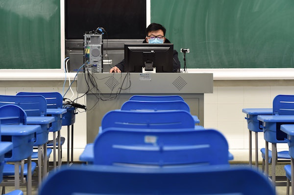 2020年2月3日,合肥第八中学老师通过网络直播给同学上课。新华社 图
