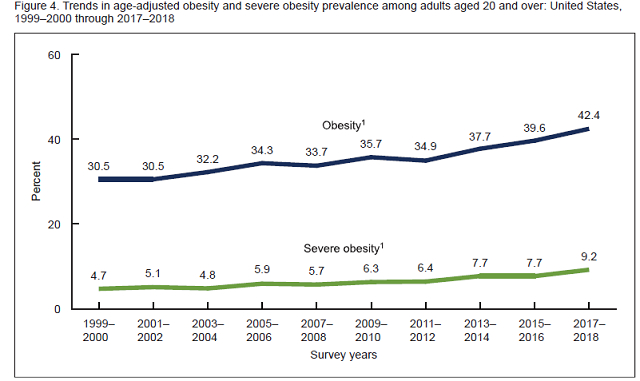 总体来看,美国肥胖患病率继续上升:从1999~2000年至2017~2018年,美国肥胖患病率由30.5%上升到42.4%,重度肥胖患病率由4.7%上升到9.2%。