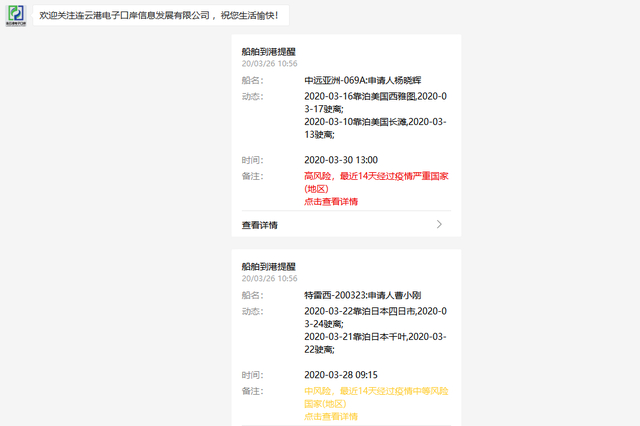记者在注册成为系统会员之后,随即就收到了一条船舶到港提醒信息。信息上显示,“中远亚洲”预计于3月30日13:00靠泊连云港港,其备注信息为红色“高风险”。点开信息详情之后,可以清晰地看到该船“过去30天内挂靠港明细”、“船员体温记录”及其他防疫相关信息。