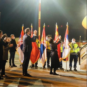 塞尔维亚总统武契奇、卫生部长、国防部长等多位政府官员在停机坪等候中国医疗队