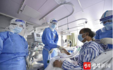 黄石市中心医院一批新冠肺炎危重患者病情好转、逐渐平稳。江苏省支援湖北疫情防控前方指挥部副总指挥鲁翔、江苏援黄石医疗支援队医疗救治及专家组组长黄英姿,来到患者病床前为他们打气。