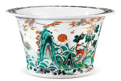 2016年5月,中国嘉德上拍了一对清康熙五彩“鹿鹤同春”描金祝寿纹大花盆,最终以约800万元成交。这对五彩花盆直径均为60.5厘米,通体呈圆形,折沿外翻,板沿宽厚,边缘起阳线,造型委婉亦有刚性,做工精致富有力度。盆身外壁以五彩为饰,实有红、黄、黑、深绿、浅绿、碧绿、翠蓝、茄紫共八色。盆身主图为“鹿鹤同春”,只见松树前瑞鹿回首仰视,与飞翔在天空的两只仙鹤相呼应,松树枝叶婆娑、虬枝蜿蜒、生机盎然,地上叠石错立,翠竹相掩。整幅画面构图饱满,绘画精美细腻,处处一丝不苟,瑞鹿均以极细之笔触反复点涂轻画,将鹿毛质感表现得非常逼真,其情态之写实传神,令人叹为绝妙。画面上苍枝之渲染,叠石之层次,均展示出画师非凡的绘画技巧,画师以黑彩勾勒轮廓,线条挺立,乱石崚嶒,以各式绿彩设色,色阶丰富,立体感极强。