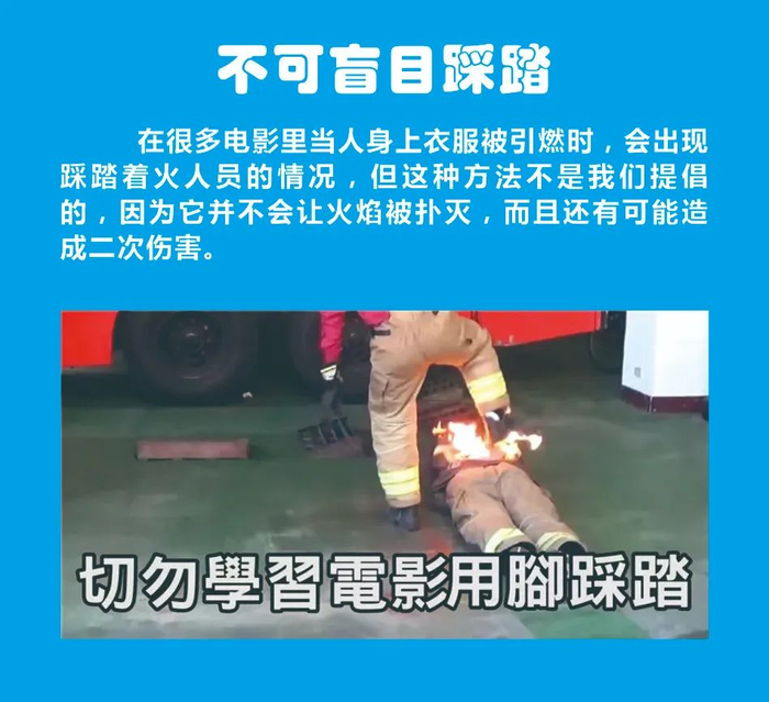 当发现身上衣物着火时,首先要“停下来”不要再奔跑,因为奔跑非但不能使火焰熄灭,反而会越着越大!