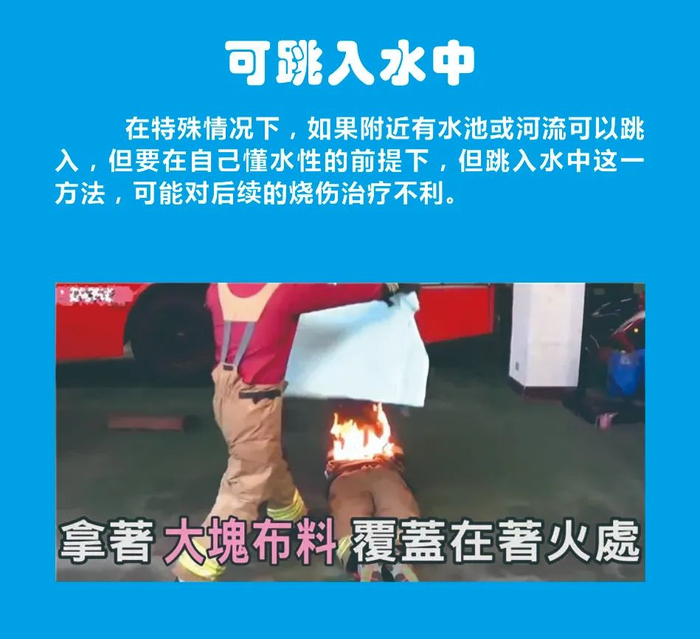 如果着火时不能第一时间将衣服脱掉,那就要马上趴倒在地上,来回打滚,将火压灭。(注意在打滚过程中要刻意覆盖着火区域。)